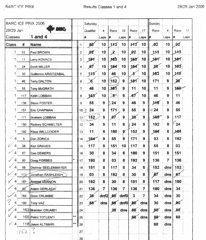 Sunday: Sunday afternoon's first race of the day and the 740 developed a high idle (3000 RPM) on the mock grid that appeared to be cured upon tapping the side of the Throttle Position Sensor (TPS). However the problem returned on the grid and persisted in an unpredictable “on-again-off-again” manner throughout the race. This made for some very difficult driving on very slippy conditions. The engine would also sometimes bog down on attempted acceleration onto the straight. The shift knob, which has a tendency to come off in older Volvo’s and therefore had been screwed through the side to the shaft of the shifter, split where the screw went through and came away in my hand during a downshift into turn one. It probably should have been glued as well. I tossed the knob and then, grabbing the top of stick, I was stabbed by the screw which was still in the steel shaft – ouch! At about this time I was chasing Terry Dalton down the straight into turn one. I late braked, got up the outside of Terry and followed the lovely “berm” that was developing around the outside of the first turn. Terry chose an early “J”pex and then headed across the middle of the turn. We met on the exit of the turn, side by side, with barely enough room for me to squeek past between the bank and Terry’s car which was sliding into the side of me. As Terry made contact we were neck and neck and side by side. The sideways momentum of Terry’s car pushed the 740 up onto the outside snowbank where I thought for sure I was gonna roll right back down on top of him as I looked out the passenger window into Terry’s lap. But both of us kept our speed up and with foot still in it I got back down onto solid ice and completed the pass to finish second behind Larry Kovacs.
