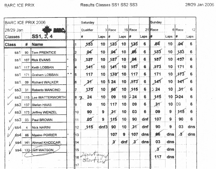 those qualifiers :-( We have new sponsorship from Mobil One Oil thanks to the Swains and thankyou for the case of Mobil One that I won in the sponsorship draw on Sunday! We also have TireCraft supporting the Street Stud racing helping to cut down the cost of tires. We also have of course the return of Magnum Fine Printing as the ice race series sponsor. Thanks to all who helped make this weekend a success. The Cars: