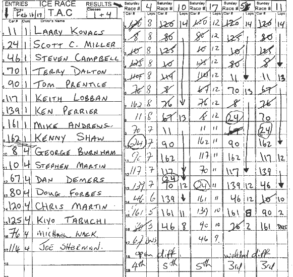 up for it this weekend although I have no pictures. Basically I blew up the motor in the Ol' Green Ovlov last weekend (3rd weekend) and wound up buying another Volvo station wagon (black) from Todd McCall (SAC#118). I towed both cars to Port Perry to Reach Park Motors and parked them beside each other in the garage. The green wagon had toasted a bearing and rod etc etc but not bad after three and a half years of abuse. After assessing both cars it was decided to replace what was needed on the "new" black wagon with good parts off the green wagon. In retrospect I believe it would have been faster to just swap motors. The black wagon was supposed to have a limited slip diff in it but after removing leaking pot cover we noted that the diff was in fact open! I should have welded it at this point but thought that I might learn how to drive open diff. HA! The black wagon has a 2.3 L injected motor while the old green wagon had a 1.8 L carb. Long story short...swapped complete ignition switch/steering column (key could not be found for black one), rear door (black one had broken rear window - no key), rotors, pads, wheels, tie rod ends, exhaust, alternator, rear shocks, axle weights, interior weights. Repaired steering rack plumbing line, no power to fuel pump, fuse panel, battery mounting. Spent 40 man hours in the process of getting race ready. Much thanks to my mechanic Andy Hertzberg and to my father for all their assistance and hard work. Last weekend Dave Watson told me that would be it for his ice racing this year as he is off to new work location in California. But there he was for Saturday. Winds up he probably should have stayed home as he toasted the left front in a collision which involved Carol Raitt and a white Hundai. Mike Zenon had a fun time racing in rubber to ice although he still has a problem with the car's computer. Results: AIl I have is class 1, 4